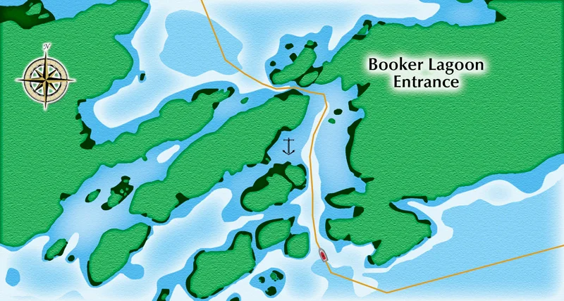 The entrance channel to Booker Lagoon is straight forward until to get to Booker Passage. If you do not want to negotiate Booker Passage into the main Lagoon, there is an anchorage on the West side of the channel just South of the entrance to Booker Passage. (see anchor symbol on the chart below) This is a popular spot so you cannot always be assurad that space will be available.
