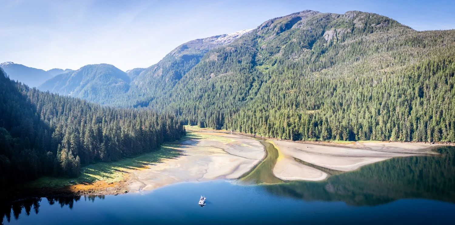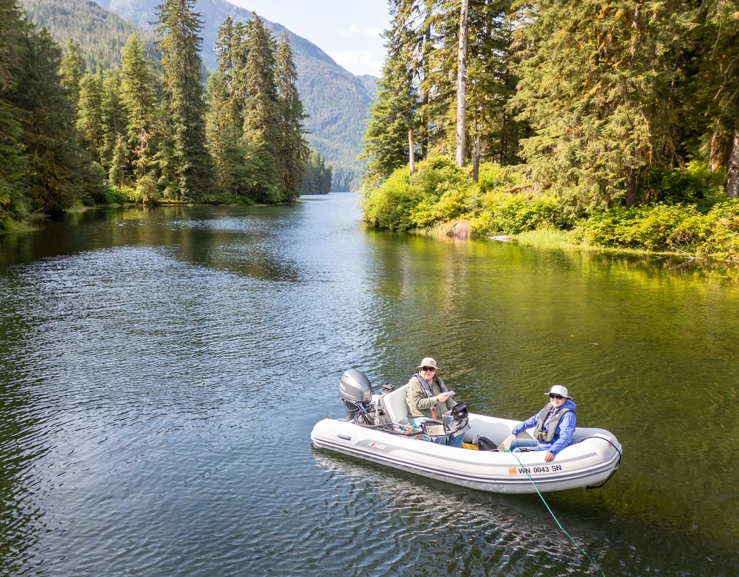 At 15.4 feet on Rudyerd Bay’s tide station, we squeezed into the river with just three feet under the dinghy. The river lived up to its name—subtle fizzing in the current really did look like champagne bubbles. When it shoaled, we dropped the dinghy anchor, launched the drone, and captured sweeping shots of this hidden valley.