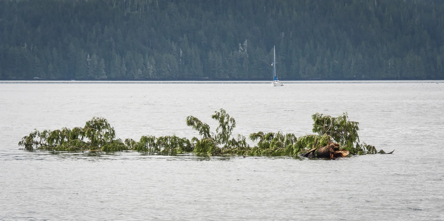 Our travels are uneventful, but with the big tides, the waters are rich in debris. An “as plotted” course never works for long, as we end up dodging all manner of logs.