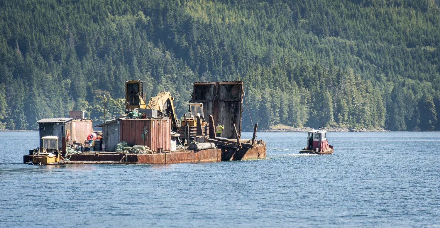 As we were nearing the last quarter of the channel we saw traffic going our same way. Leading the procession was a very small “yard tug” pulling a large barge. It looked as if they were repositioning a logging camp. We slowed a couple of knots so as to not run too close to the other powerboat following the barge.
